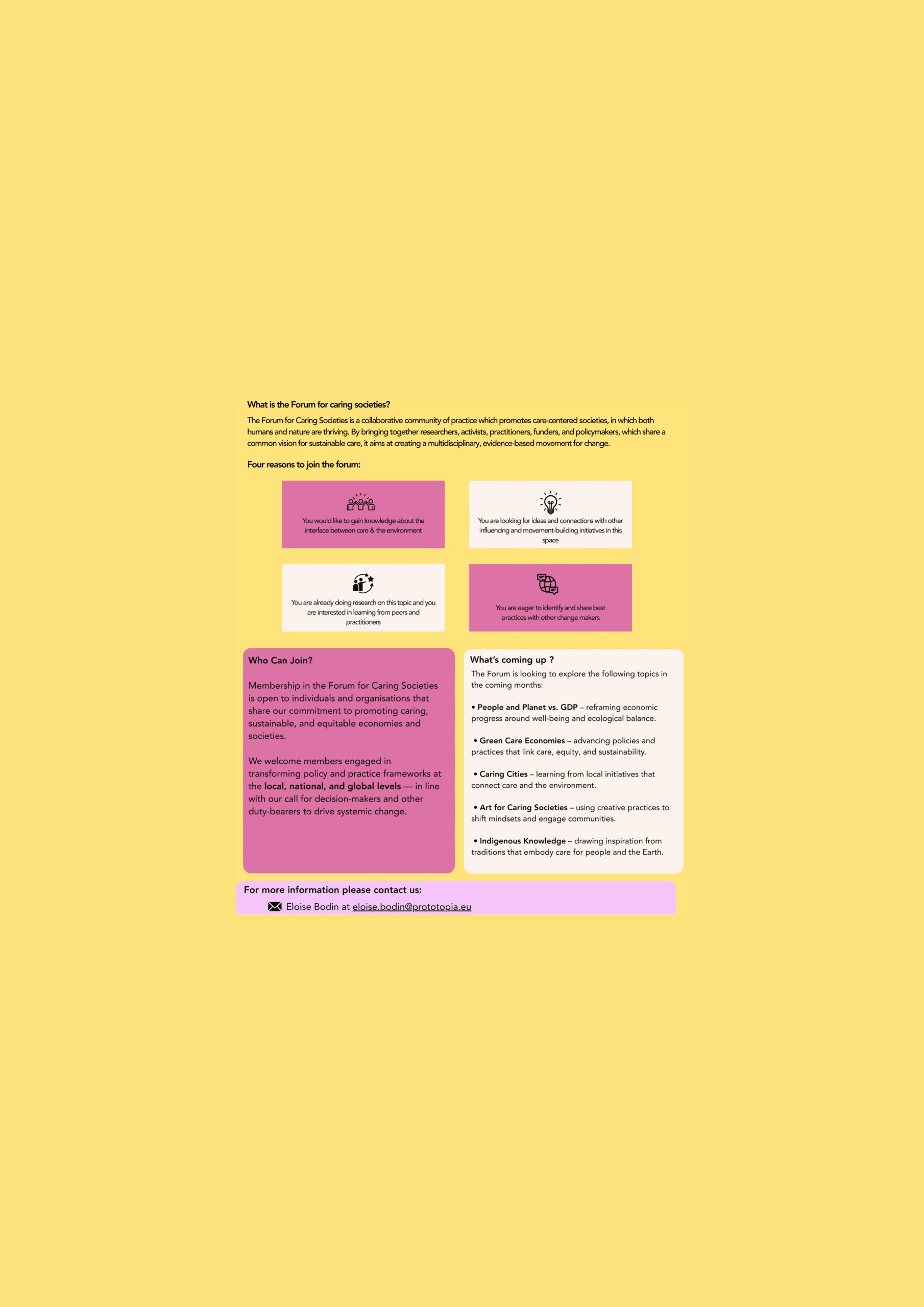 In 2022, Hot or Cool established a Commission on Care-centred Transition which since transformed into the Forum for Caring Societies. In 2025, the Forum is being relaunched, with Pro(to)topia providing the secretariat function, with a focus on the nexus between care and sustainability.